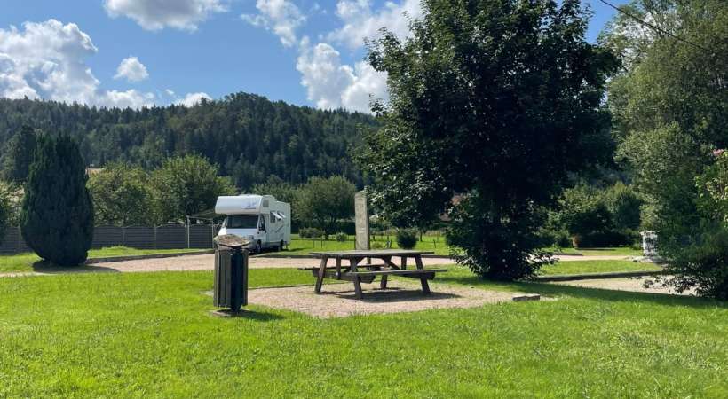 Borne de service (type Campiflux) avec monnayeur (2€) : eau et électricité ; éclairage crépusculaire ; table de pique-nique, poubelle.