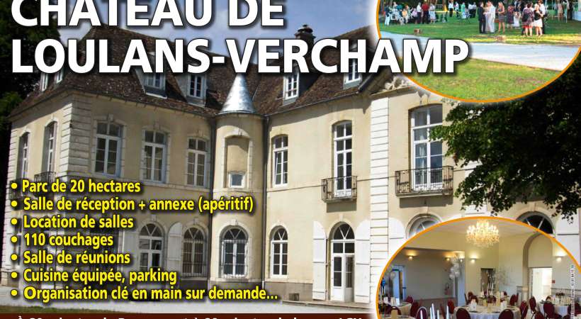 Le Château de Loulans construit en 1732 se situe à 30 km de Besançon. Il possède deux salles pouvant accueillir 150 personnes chacune. Possibilité d'hébergement grâce à 40 chambres toutes équipées d'une salle de bain individuelle. Le bâtiment est entouré de 2 cours d'eau et de 20 Ha Complexe de réception pour mariages, baptêmes, anniversaires, fêtes de familles.