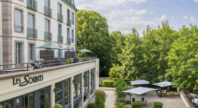 Etablissement situé face au parc thermal. Superbe bâtisse de 1860 entièrement rénovée à 100m des Thermes, tout proche du Casino, du cinéma et du centre ville historique. L'hôtel Résidence Les Sources dispose de 41 chambres studio équipées de kitchenette ; d'une salle de bains avec douche à l'italienne, wc indépendant, sèche cheveux, radiateur chauffe serviettes ; télévision écran plat avec TNT et Canal+ .